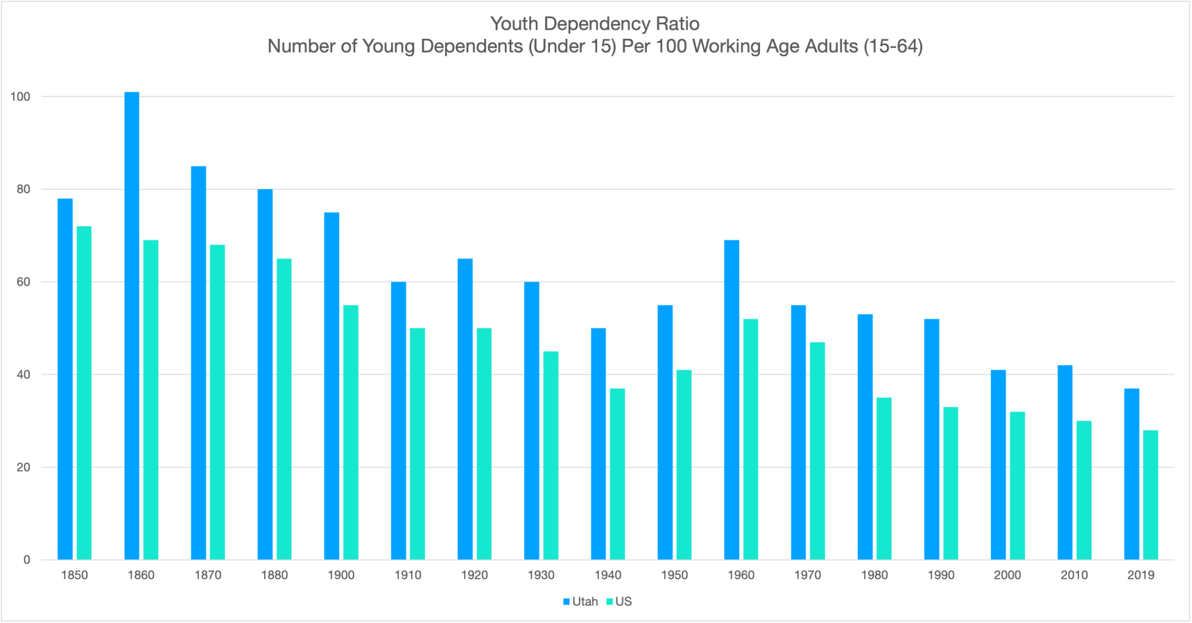 Youth of Utah Relative to the U.S. According to Census Numbers[4]